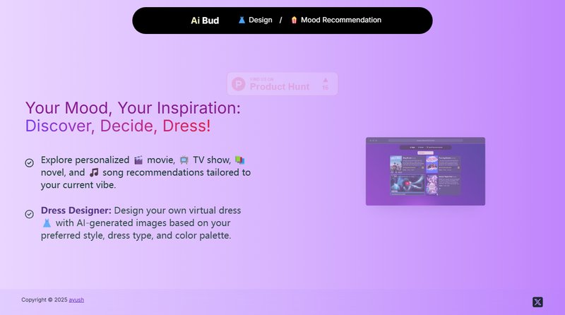 AiBud是一个结合娱乐与时尚的个性化推荐平台,提供电影、电视剧、小说和歌曲的推荐,并允许用户设计虚拟服装。