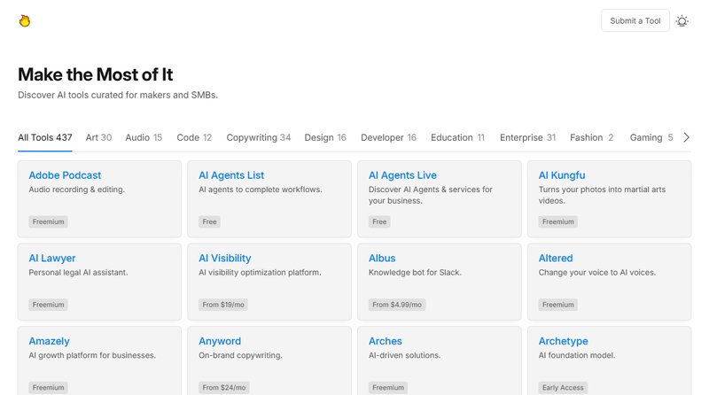 - 工具发现:用户可以浏览和发现各种AI工具,涵盖音频、视频、编程、设计等多个领域。